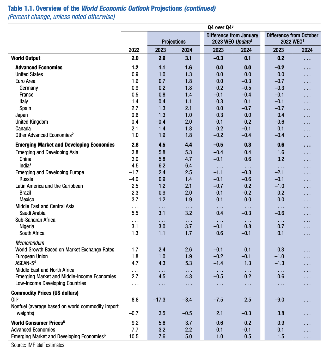 “疲软的前景反映出降低通胀所需的紧缩政策立场、近期金融状况恶化带来的影响、俄乌冲突持续以及日益严重的地缘经济分裂,”展望中写道。