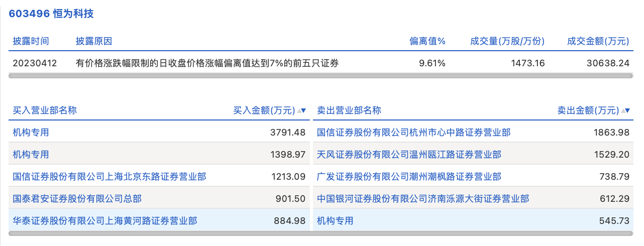 4月12日,恒为科技今日涨停,龙虎榜数据显示,上榜营业部席位全天成交1.35亿元,占当日总成交金额比例为44%。其中,买入金额为8190.02万元,卖出金额为5290.0万元,合计净买入2900.02万元。