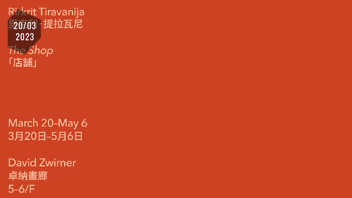 卓纳画廊将呈献里克利ㆍ提拉瓦尼的全新参与式展览。《店铺》(The Shop)重现了一个香港随处可见的修伞铺,作品的灵感来自中国作家刘慈欣的科幻著作《地球往事》三部曲,它们是中国在国际上最为畅销的图书系列之一。这将是艺术家自宣布与卓纳画廊合作以来首次举办的画廊个展。