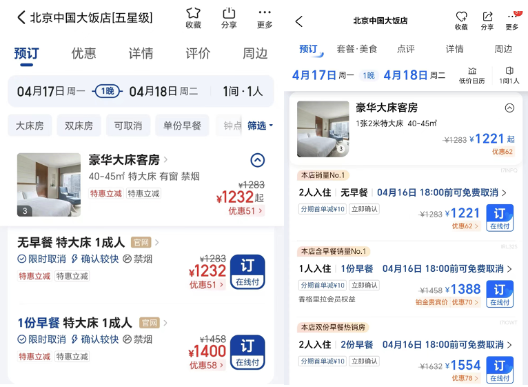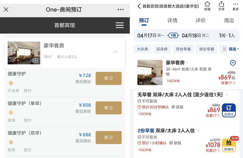 同为豪华型的北京首都宾馆,4月17日豪华客房不含早价格728元,含双早888元。