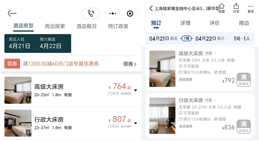 作为开在陆家嘴中心地带的酒店,亚朵S酒店4月21日的高级大床房官方最低价764元,携程的价格是765元,与官方基本持平。