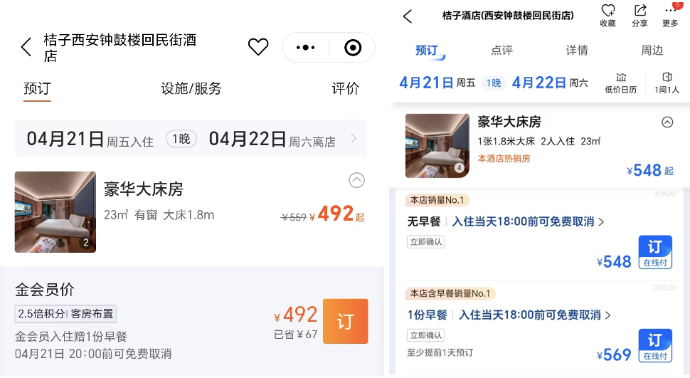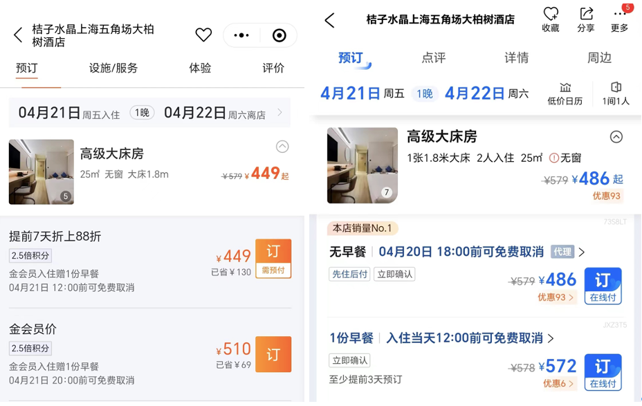 比如4月21日的高级大床房,官网最低449元可拿下,并赠送一份早餐。同样的房型携程不含早餐486元,含1份早餐要572元,比官方价格高120元以上。