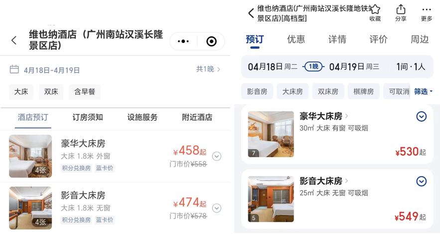 维也纳酒店汉溪长隆地铁站景区店,官网最低458元的豪华大床房,在携程是469元,但到了美团,最低得花530元。