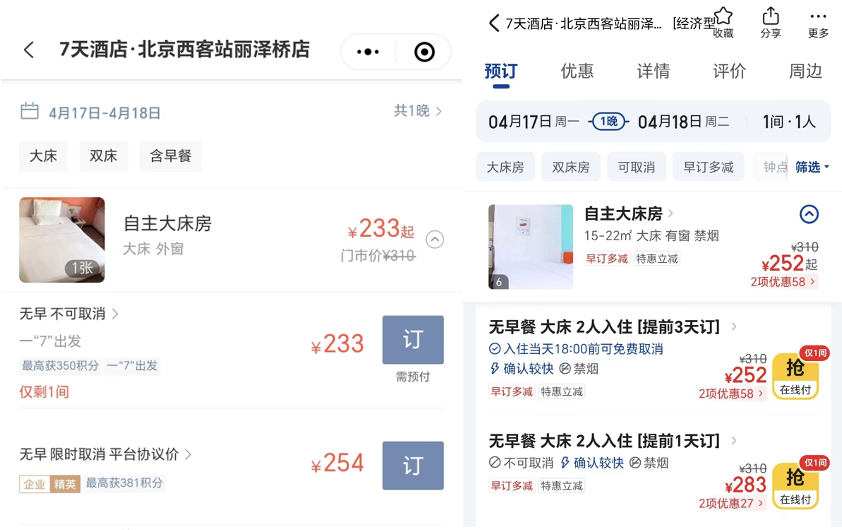 以7天酒店北京西客站丽泽桥店为例,其自主大床房官方渠道最低价233元,美团最低要252元;精选双床房官方最低283元,美团最低要305元。