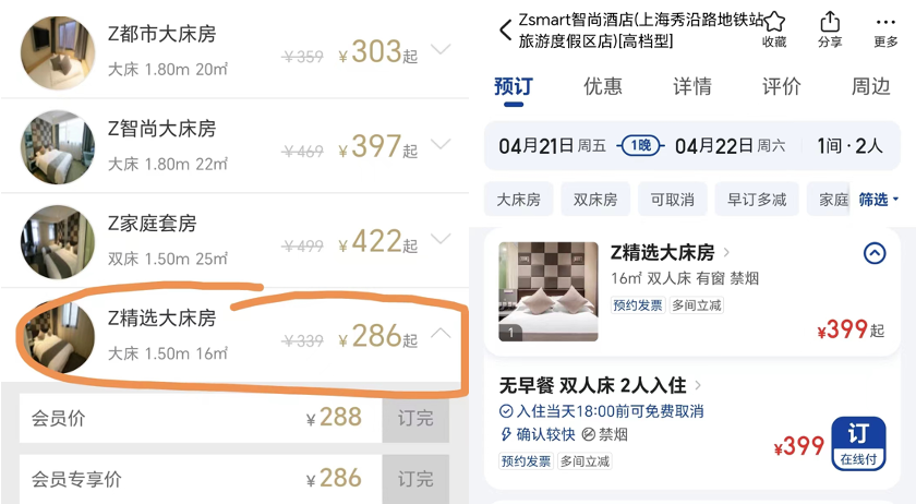 智尚酒店秀沿路地铁站旅游度假区店,主要接待的是前往迪士尼的旅客。4月21日,酒店最便宜的房型是286元的Z精选大床房。