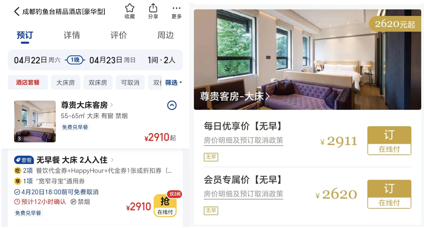 在携程的售价为2619元,与酒店持平。但美团的价格达到2910元,比酒店官方贵290元。