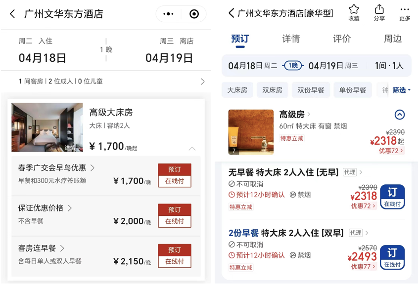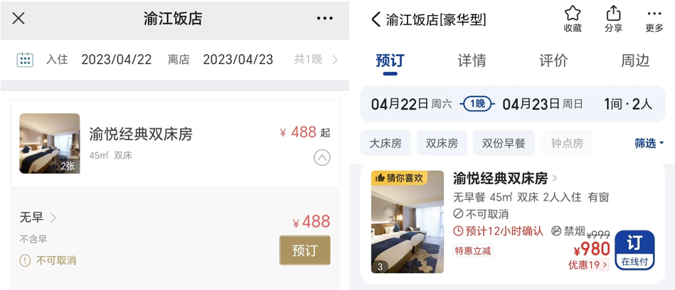 2、线上平台通常会以多重优惠吸引用户下单,但很多时候优惠后的价格比酒店官方还高。