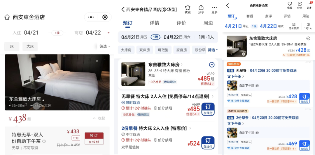 4月21日的东舍雅致大床房,官方无早房间只需要438元,含双早、双人份自助下午茶也仅需478元。