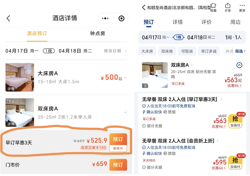 美团含1份早餐的房型提前7天预定要499元,提前3天预定则要510元,均显著高于官方价格。