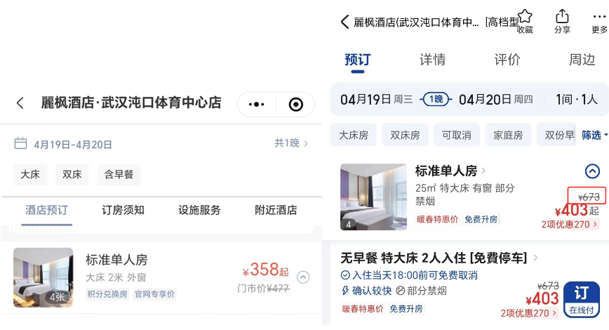 但美团同样的标准单人房,售价高达403元,比官方贵了45元,比携程贵了近100元。