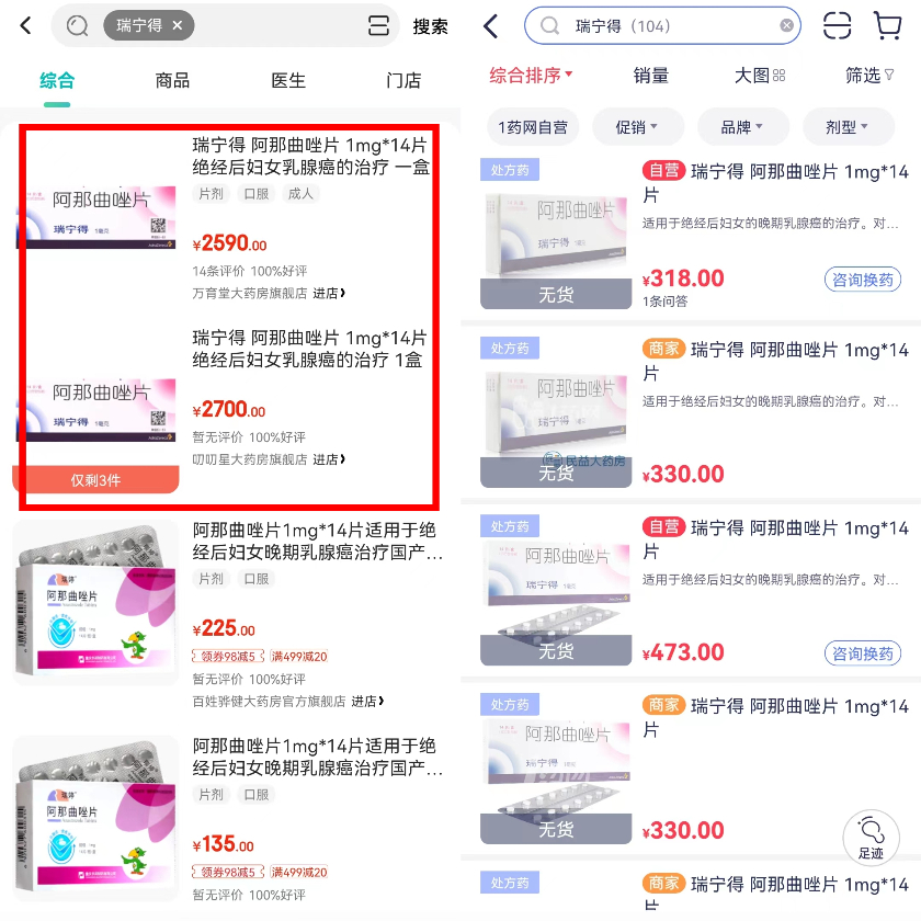 4月14日,界面新闻记者在京东健康、1药网等医药电商平台查询发现,多个店铺显示瑞宁得无货,或仅有少量供应,价格也从医保支付价的两三百元暴涨至2500元以上。