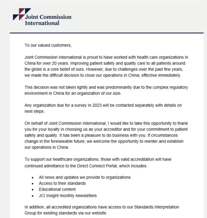 在与中国医疗保健机构合作超20年后,Joint Commission International(国际医疗卫生机构认证联合委员会,下简称:JCI)被传出将关停中国的认证业务。