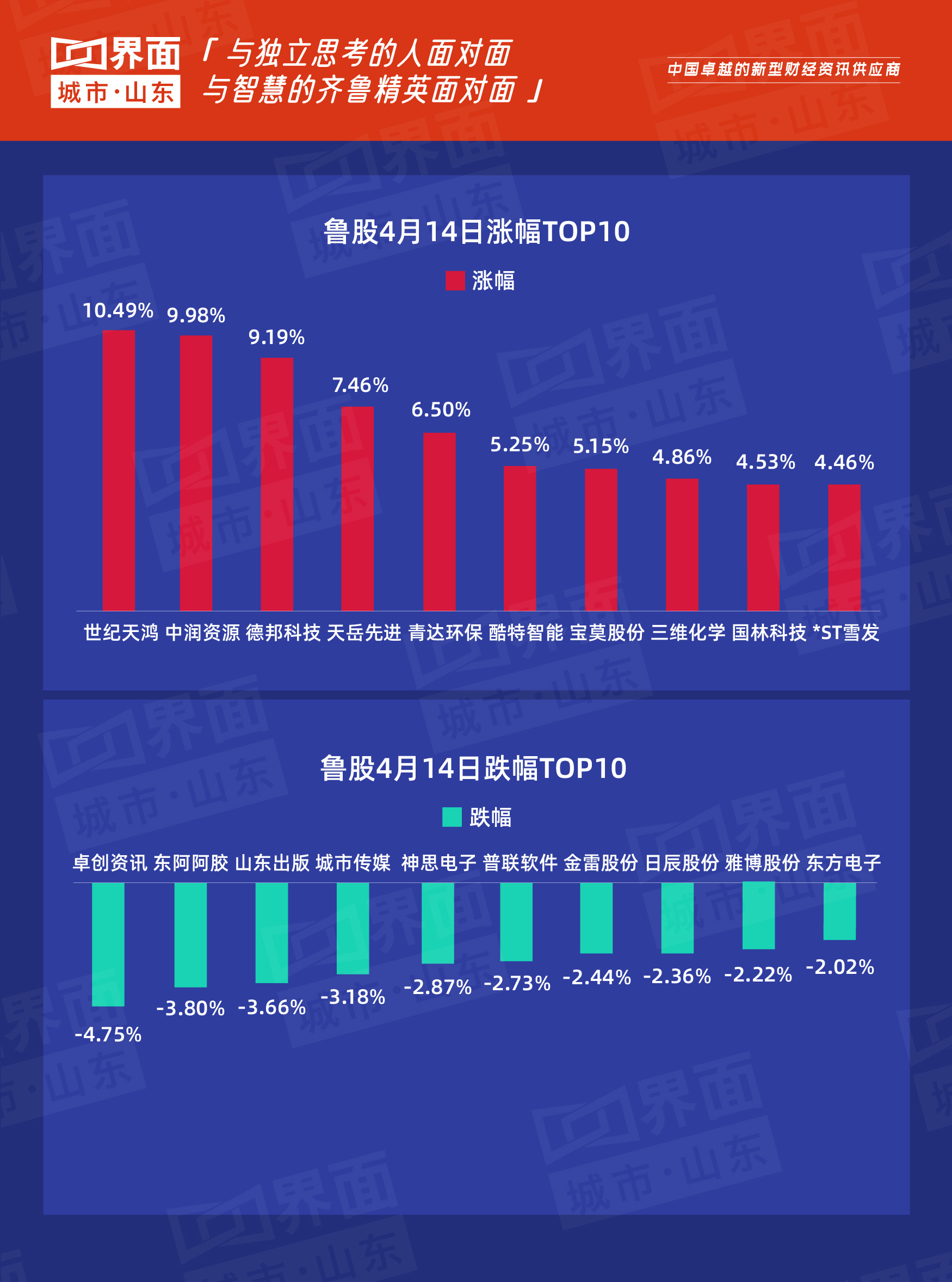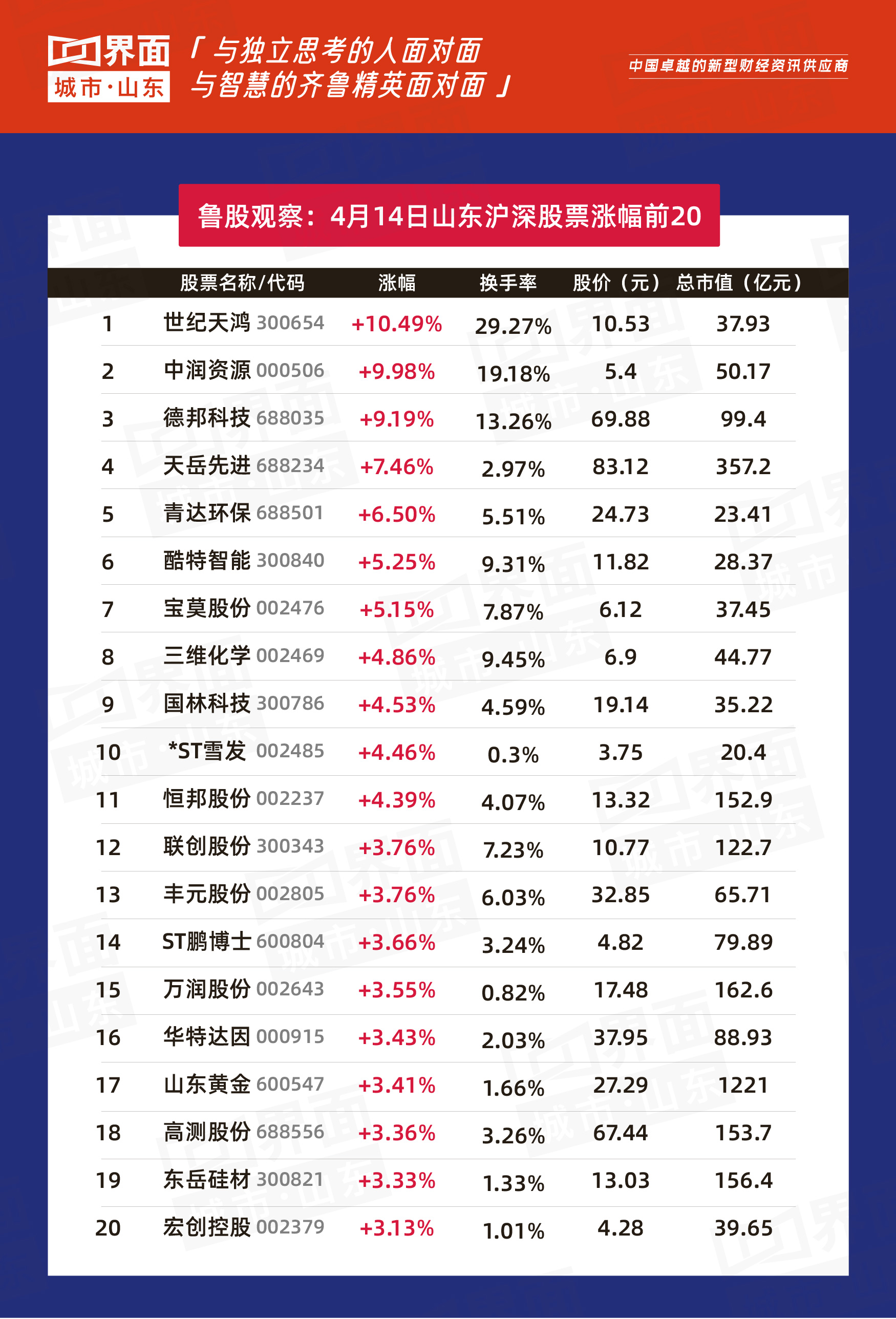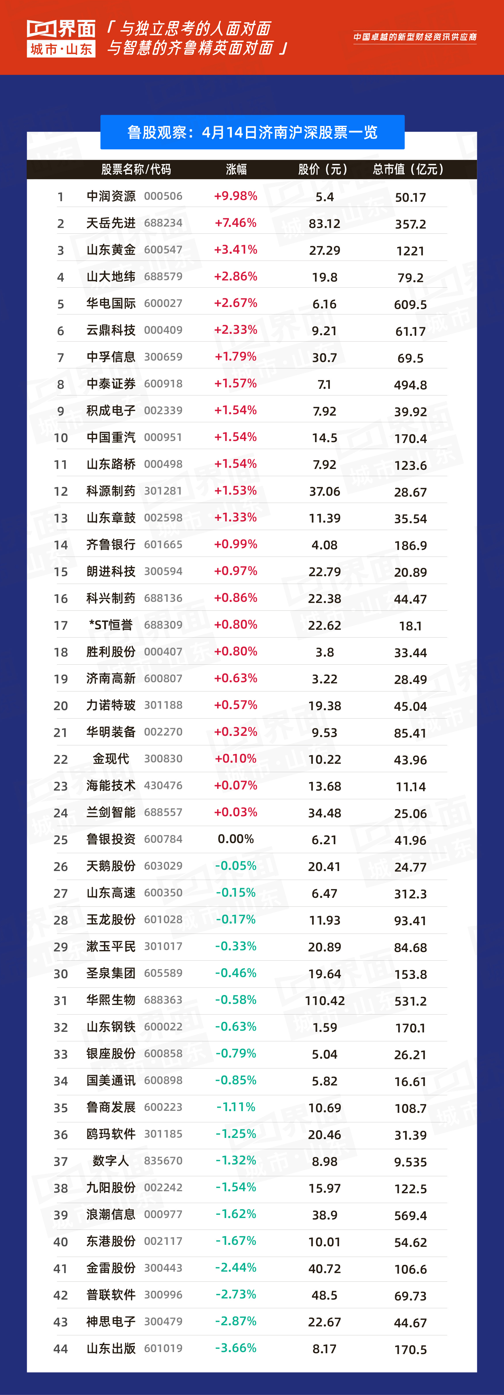 4月14日,山东151只个股上涨,126只个股下跌。