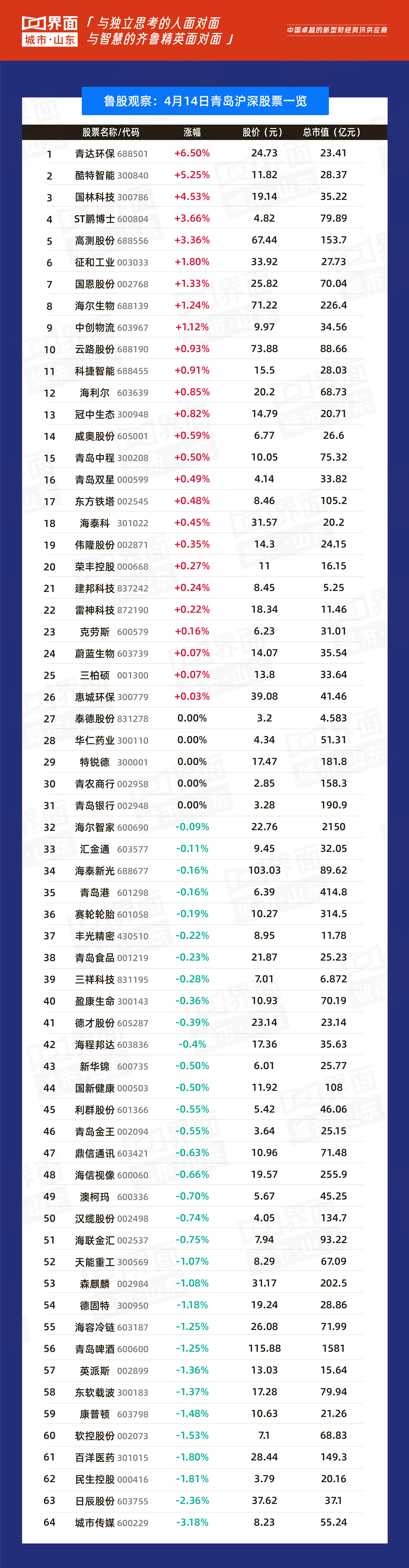 青岛市涨幅榜首:青达环保(688501),涨幅6.50%,股价24.73元,总市值23.41亿元;