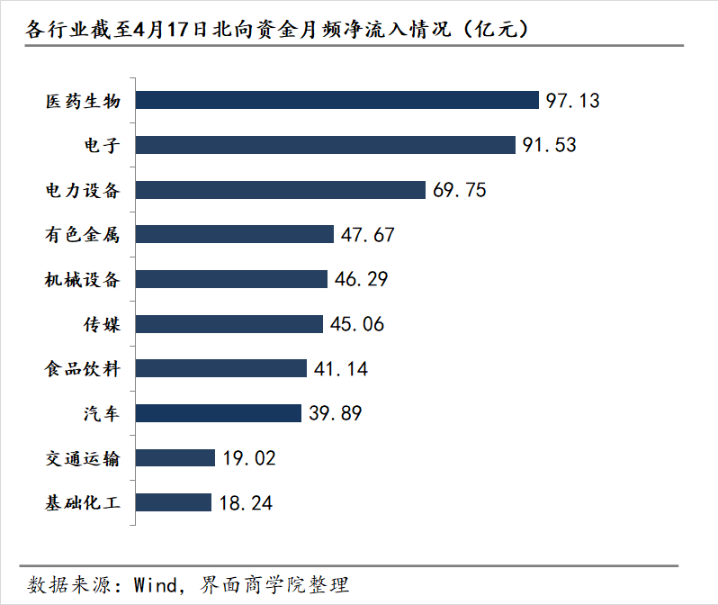 以申万31个一级行业为基准,截至4月14日的月频申万一级行业数据显示,北向资金流入显著的前三板块分别为医药生物、电子以及电力设备,月流入分别为97.13亿元、91.53亿元和69.75亿元。而北向资金撤出的前三板块分别为银行、家用电器以及非银金融,月流出分别为50.1亿元、37.48亿元与32.25亿元。