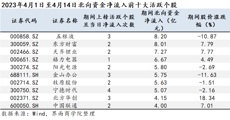 从北向资金活跃个股净流入金额上看,五粮液(000858.SZ)、东方财富(300059.SZ)、天齐锂业(002466.SZ)为4月北向资金净流入的前三。