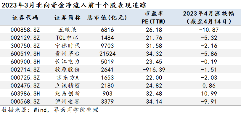 上期我们根据北向资金数据预测市场短期(后一周)下行可能性略高于上行可能性,但中期(后一月)可能向好。下图为上期2023年3月北向资金净流入前十大个股的后续表现情况,数据截至2023年4月14日,追踪区间为2023年4月1日至4月14日。排序以上期资金净流入为基准。