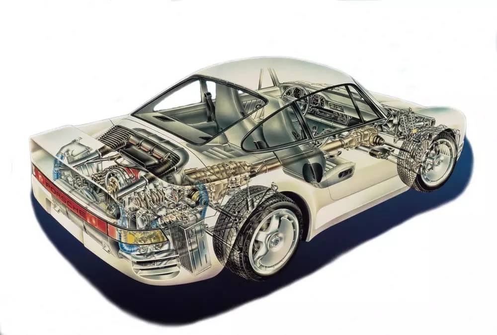 959使用了两台KKK制造的涡轮机,为了减轻涡轮迟滞,其中一个涡轮在2500rpm就会开启(以现在的标准来看实在是不够看了),到了大约4200rpm左右,两具涡轮机才会达到全增压的状态。得益于这样的设计,使得959的动力曲线比起F40更加线性。