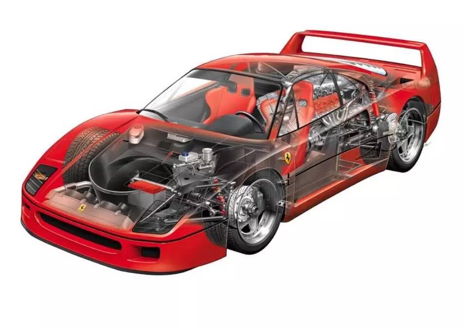 在悬架部分,F40用上了四轮双叉臂悬挂,但是减震器还是用传统直立式设计,并不像现今许多超跑使用水平放置的设计。
