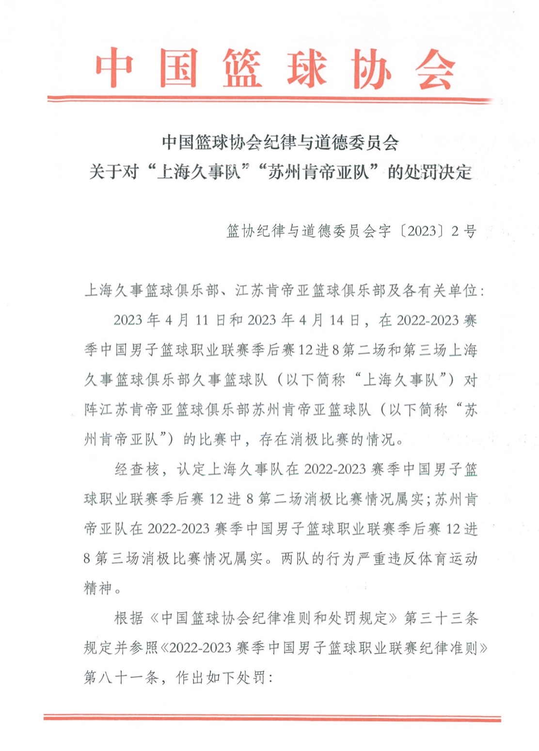 北京时间2023年4月17日,中国篮协官方发布,中国篮球协会纪律与道德委员会关于对“上海久事队”“苏州肯帝亚队”的处罚决定。