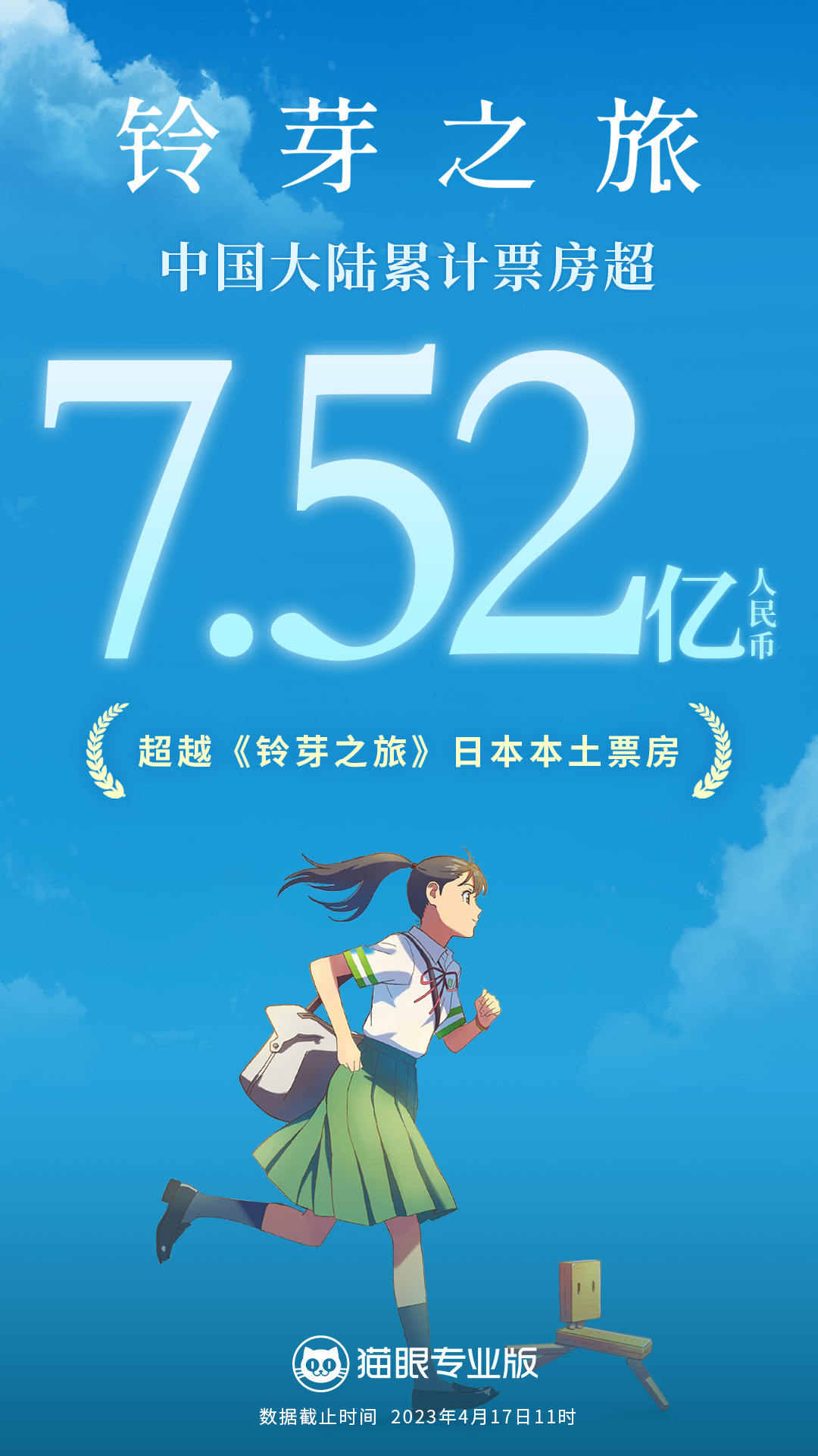 4月17日,据猫眼专业版数据,日本动画电影《铃芽之旅》中国大陆累计票房超7.52亿元人民币,超越日本本土票房成绩。
