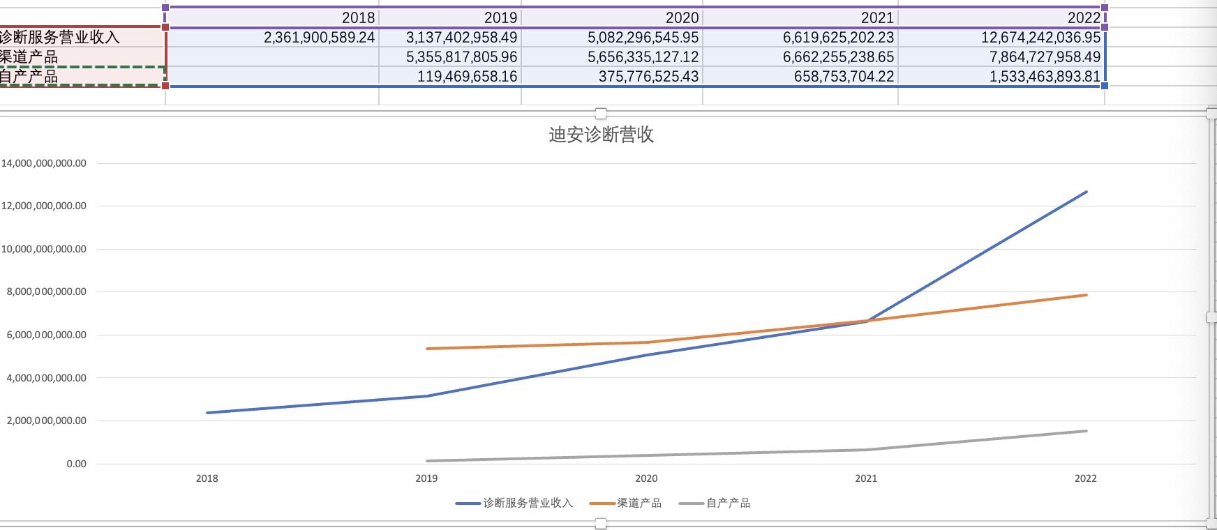 在常态化核酸筛查期间,迪安诊断的诊断服务业务业绩暴增,从2019年的31.37亿元占总营收的33.90%,增长至2022年的126.74亿元,占总营收的62.49%。但渠道产品与自产产品的收入基本在新冠疫情期间是无明显增长的。