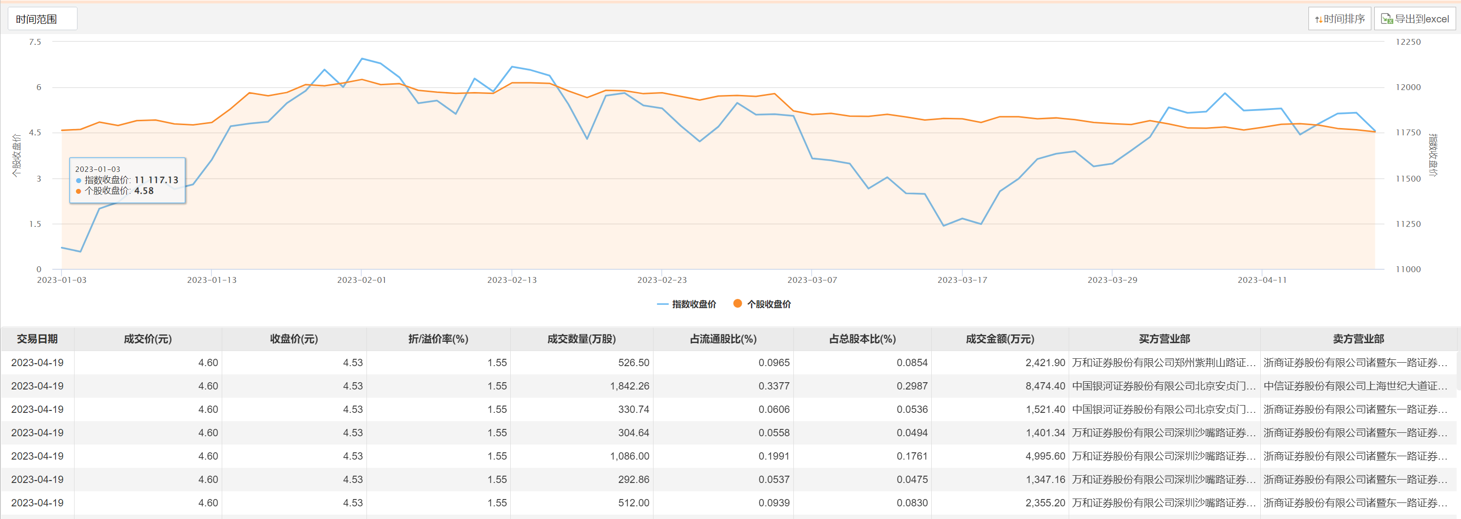 中公教育今日出现2.25亿元溢价大宗交易,成交价4.6元/股(今日收盘价4.53元)。买方为银河证券北京安贞门营业部、万和证券深圳沙嘴路营业部、万和证券郑州紫荆山路营业部,卖方为中信证券上海世纪大道营业部、浙商证券诸暨东一路营业部。