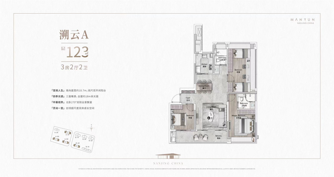 主卧依旧是行政套房设计,开间约4.8m,阳台为全景落地窗,整体空间感更奢阔。