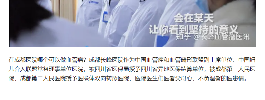 在知乎上,账号“长峰血管瘤咨询”在2022年8月曾发布信息称,作为中国血管瘤和血管畸形联盟副主席单位、中国妇儿介入联盟常务理事单位医院,成都长峰医院被四川省医保局授予四川省异地医保结算单位,被成都第一人民医院、成都第二人民医院授予医联体双向转诊医院。成都第一人民医院、成都第二人民医院都是三级甲等医院。