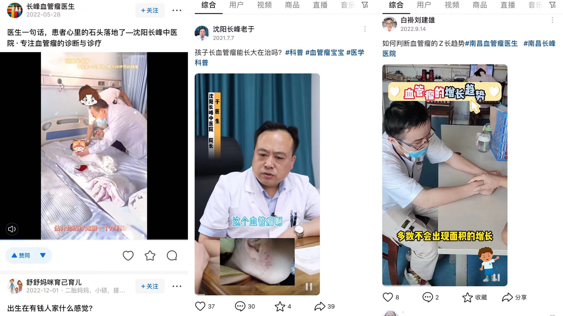 和很多医疗机构一样,长峰医院也在社交媒体开展医疗故事的营销,其故事标签为专业且高尚。专业部分,主要是通过做科普达成,即运营一个医生账号,讲述血管瘤是什么、血管瘤是如何生长的、可以怎么治疗之类的话题。并且,这个医生账号的名称多为“长峰血管瘤某医生”。