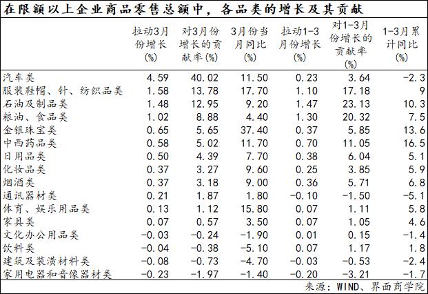 就3月份而言,汽车类贡献最大,对限额以上企业商品零售总额3月份增长贡献率为40.02%。