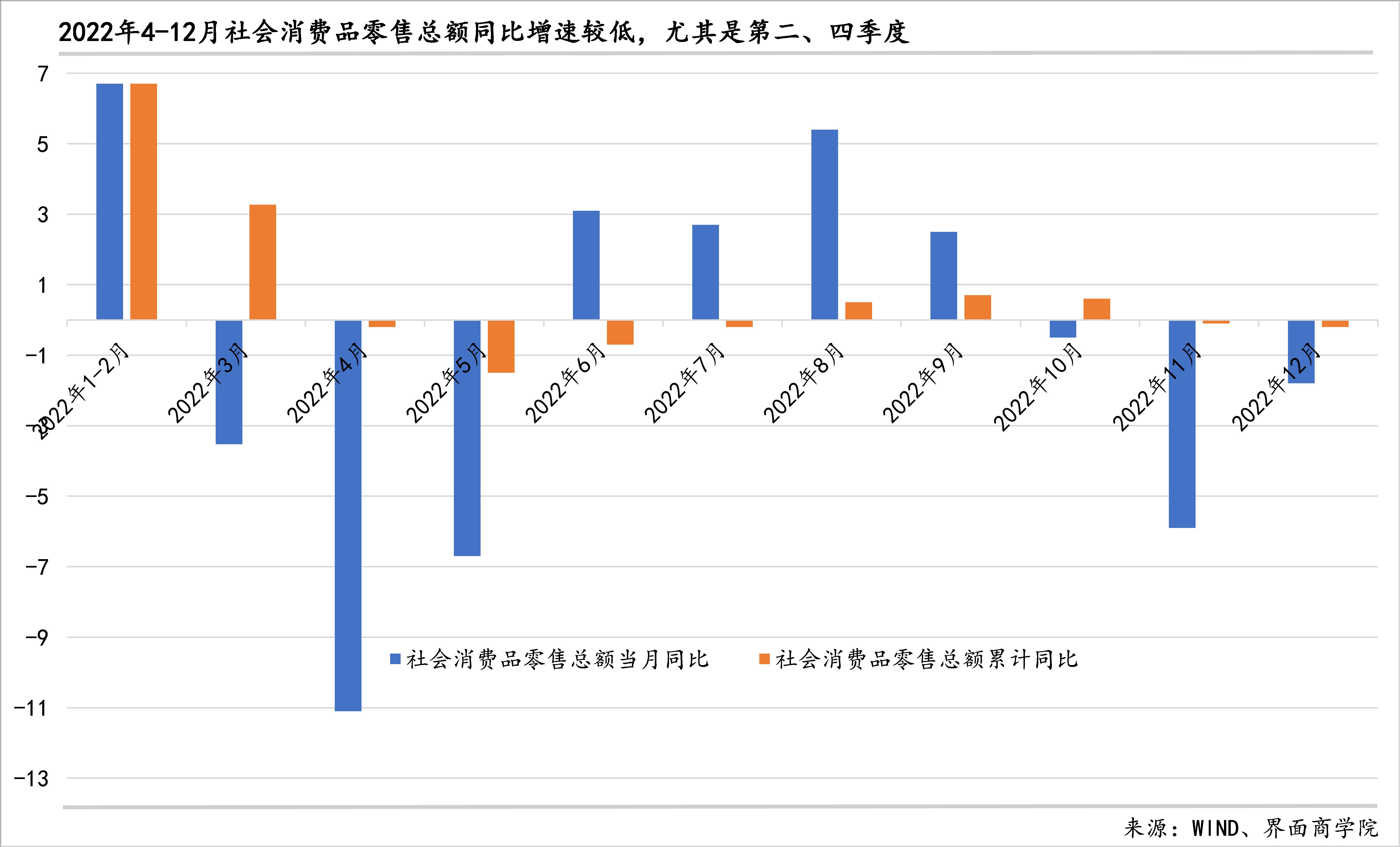 就社会消费品零售总额而言,线下消费的贡献率显著上升:防疫措施调整后,线下消费(含餐饮与线下商品零售)贡献率上升。3月份,线下消费拉动社会消费品零售总额当月同比增长6.28%,贡献率为59.3%;1-3月份,线下消费拉动社会消费品零售总额累计同比增长3.39%,贡献率为58.8%。去年前3月,线下消费拉动社会消费品零售总额增长1.19%,贡献率为36.3%。从去年全年来看,线下消费拉动社会消费品零售总额下降2.88%,是社会消费品零售总额负增长的主要原因,对社会消费品零售总额下降的贡献率为1164.0%。