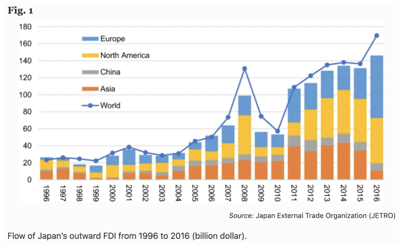 通缩预期的强化导致居民当期消费动力不足并抑制经济增长和物价,也导致企业减少日本国内投资而将目光投向海外。根据日本贸易振兴机构JETRO的数据,日本对海外对外直接投资本世纪以来持续走高,并在2000年代日本国内长期通缩的十年期间录得最大增速。