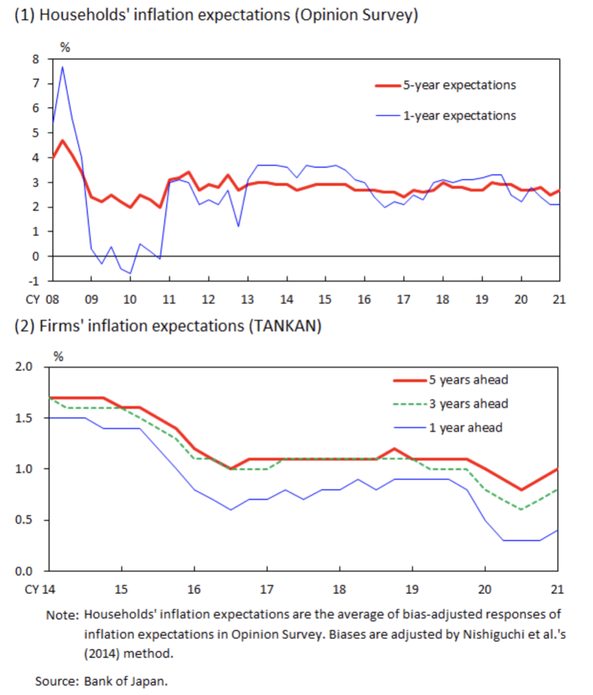 长期的物价负增长也使得日本居民和企业的通缩预期始终存在。根据日本银行发起的调查数据显示,日本家庭的1年期通胀预期在过去十年内保持在约2%水平,企业的1年期通胀预期更是始终在1%下方。