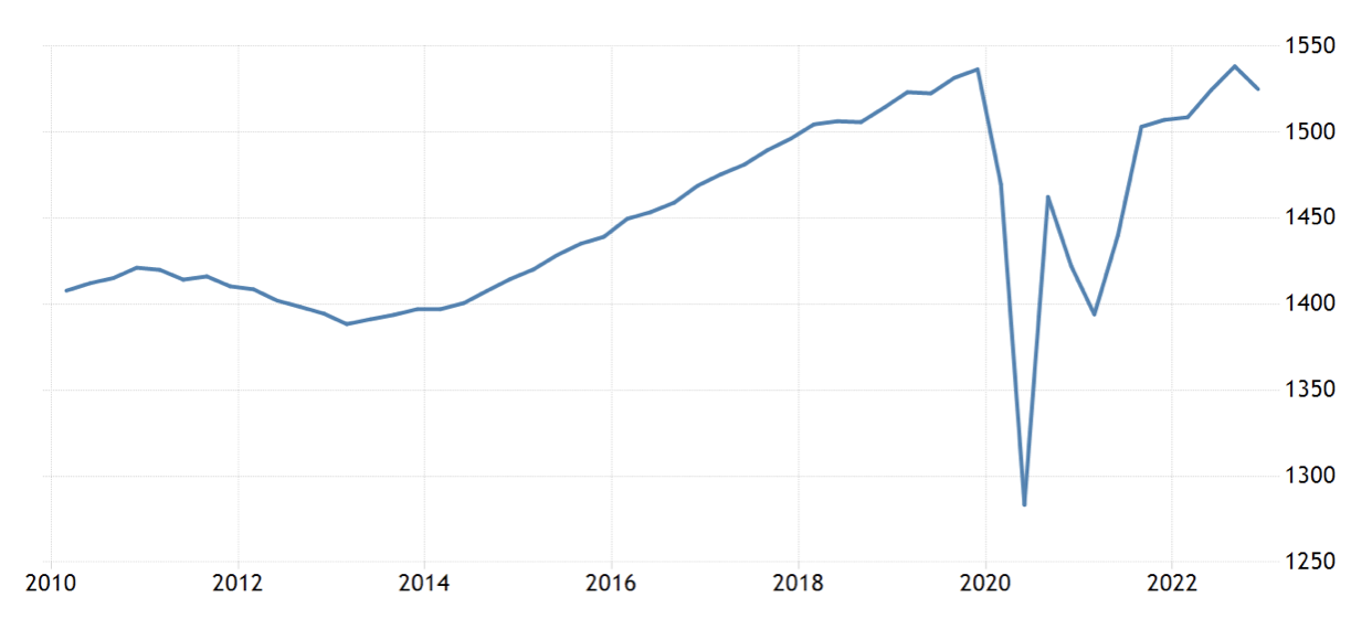 日本总务省的人口数据显示,2022年,65岁以上老年人达到创新高的3627万人,相当于总人口占比的29%。本世纪以来日本的季度私人消费支出始终在7000亿美元区间停滞不前,2022年全球大通胀背景下,日本四个季度的私人消费支出反而从6482亿美元一路下跌至5541亿美元,与2008年金融危机之前水平相同。