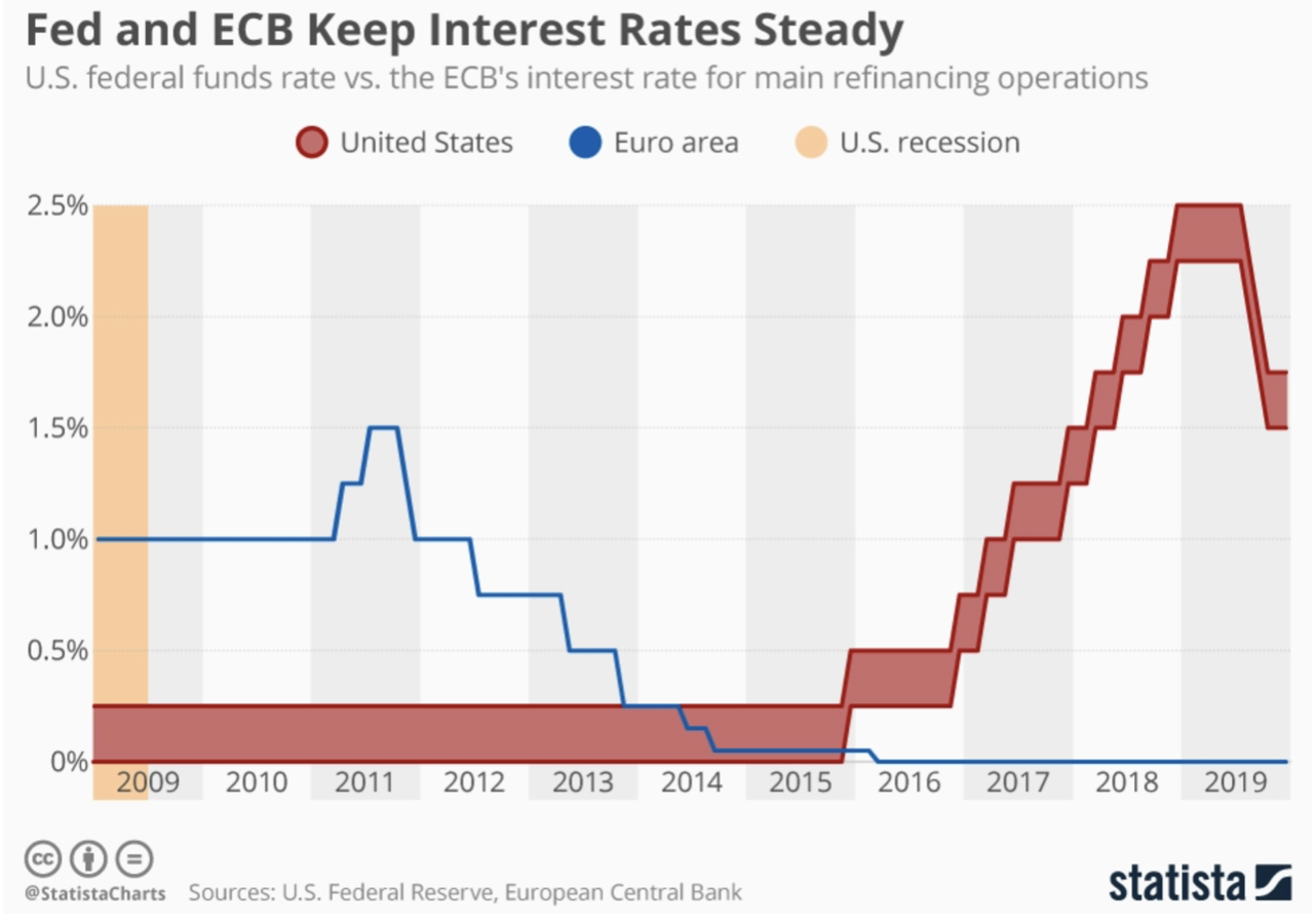 对于欧洲央行定位的争议直接导致欧元区的关键利率在2014年之前长期高于美联储的联邦基金利率。
