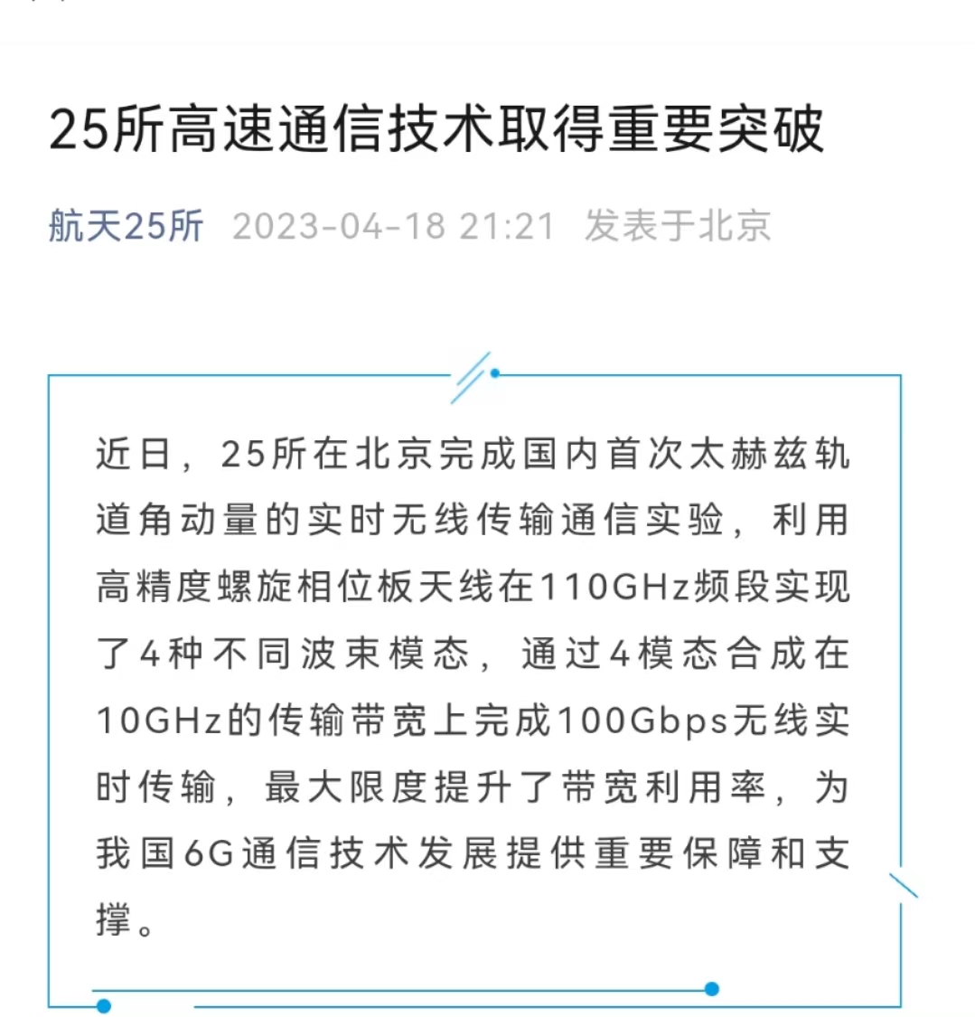 消息面上,近日,中国航天科工二院发布了一份关于6G通信技术的研究成果,内容是关于太赫兹轨道角动量通信方向的实时无线传输通信实验。值得一提的是,这是国内首次在110GHz频段上实现100Gbps无线实时传输的重大突破,标志着中国6G通信技术研发取得了重要进展。“航天25所”正是中国航天科工二院二十五所官方信息发布平台。