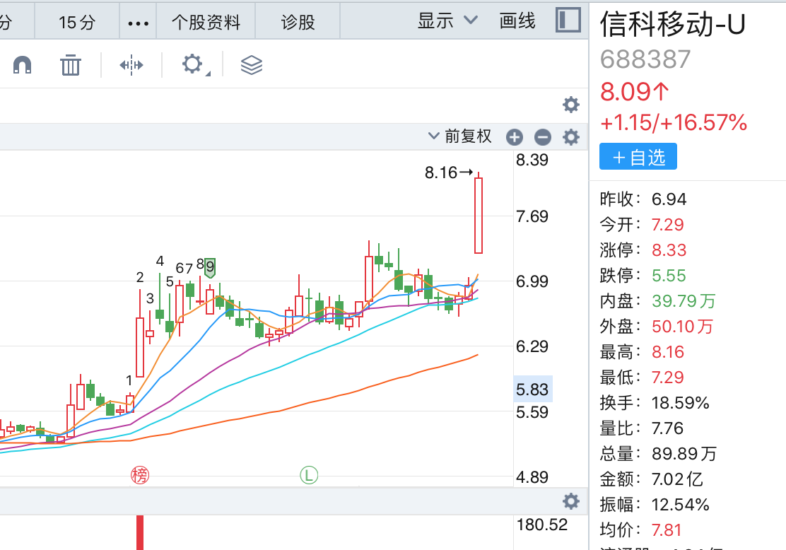 信科移动(688387.SH)早盘高开高走,前半小时里涨幅异动冲到了17%以上,截至午市收盘,信科移动的涨幅为16.57%,下午更是在13点52分触及涨停板 。作为次新股,4月20日其股价已创出其上市来的新高。