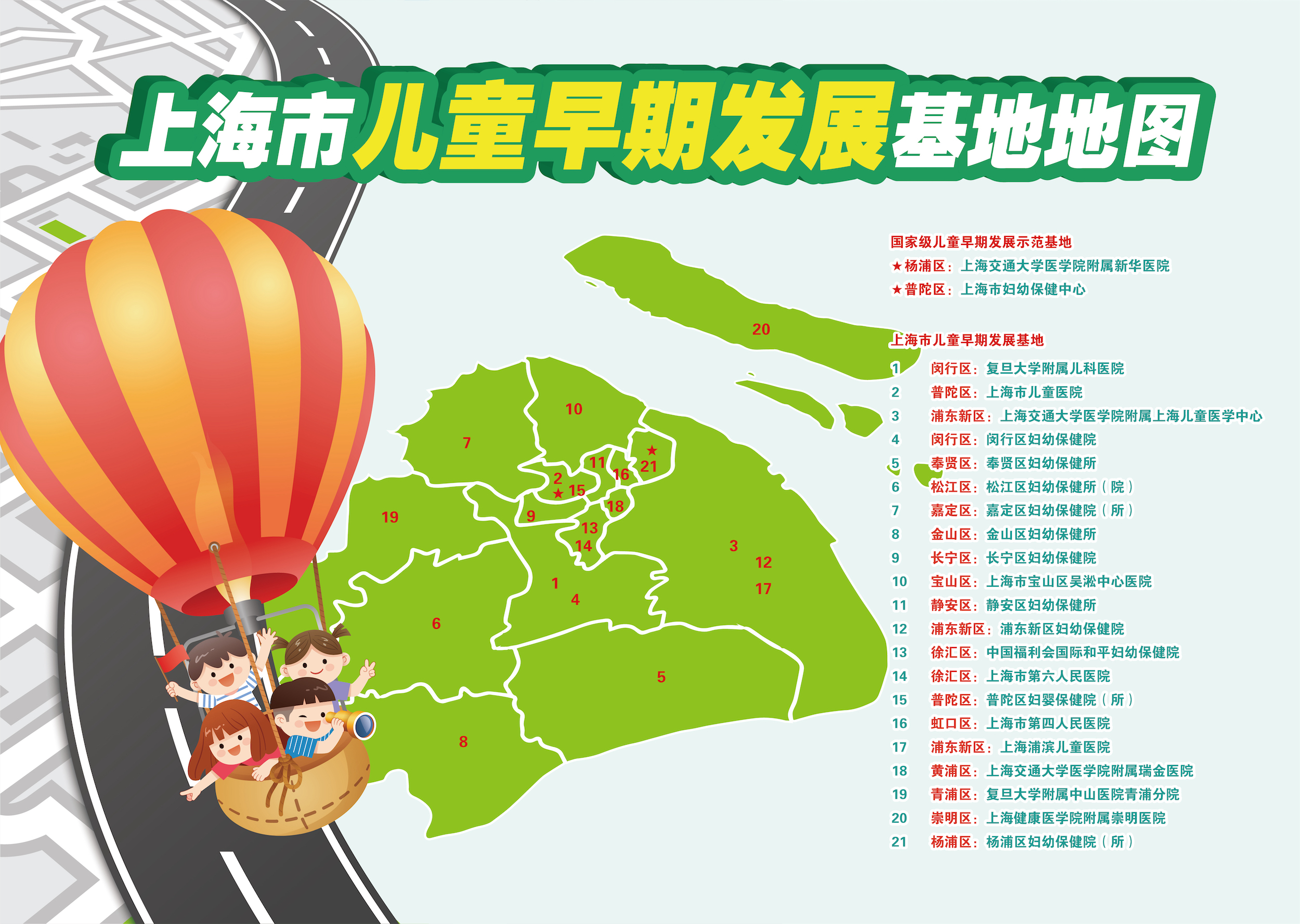 目前,上海已建成2家国家级儿童早期发展示范基地和覆盖全市16个区的21家市级儿童早期发展基地。
