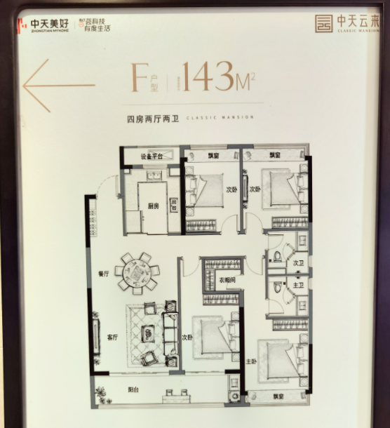 建面约143㎡户型是四房两厅两卫设计,三开间朝南,客厅和南次卧双联阳台设计。主卧套房、带独立卫浴,北向2个次卧均带飘窗,得房率高达约83%,无论是二胎家庭还是三代同堂,空间绰绰有余。