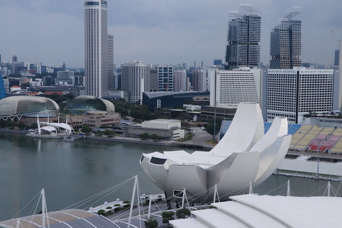 从机场乘车前往市区的途中,望向窗外的目光很难不去捕捉那座由三座塔楼构成的宏伟建筑,这是新加坡最大的酒店——滨海湾金沙酒店。2200余间客房分布于三座塔楼之中,顶部由金沙空中花园和无边泳池将其相连。登高望远,一侧是鳞次栉比的高楼大厦,一侧是无边无涯的新加坡天际线。有那么一瞬,感受到了欲与天公试比高的豪情满怀。