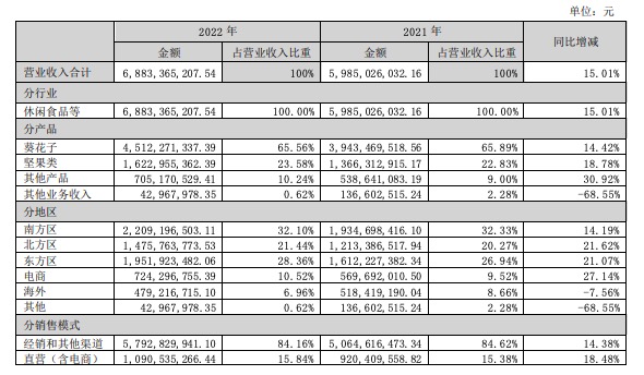 从2022年业绩来看,洽洽食品的葵花子业务仍在增长,葵花子收入提高14.42%至45.12亿元,在总营收中占比达到65.56%,与2021年65.89%的占比基本持平。
