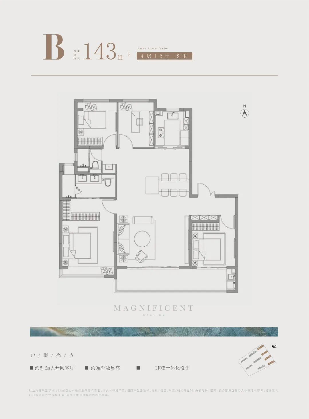 建面约143㎡户型:四房两卫设计,拥有独立入户玄关,约5.2米大开间客厅,大面宽双厅设计,约8.4米贯通式大阳台,约3米层高,尺度阔绰,主卧套房设计,有步入式衣帽间,卫生间双台盆。