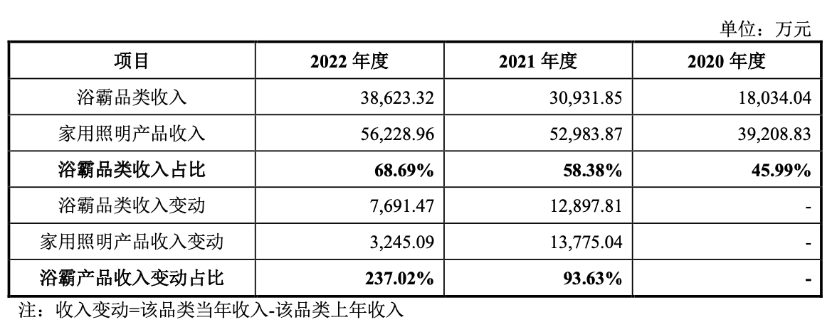 更具体来讲,浴霸产品功不可没,报告期内涨幅近2亿元,2021年、2022年其收入变动占比分别高达93.63%、237.02%,美智光电解释为,一方面浴霸产品面世及普及较晚,市场存量空间较大。公司在业内较早推出新一代风暖浴霸/风冷凉霸并不断进行产品迭代升级,报告期内市场占有率逐步提高;另外公司不断加大自营电商渠道建设,并选择浴霸产品作为线上销售的主推产品。