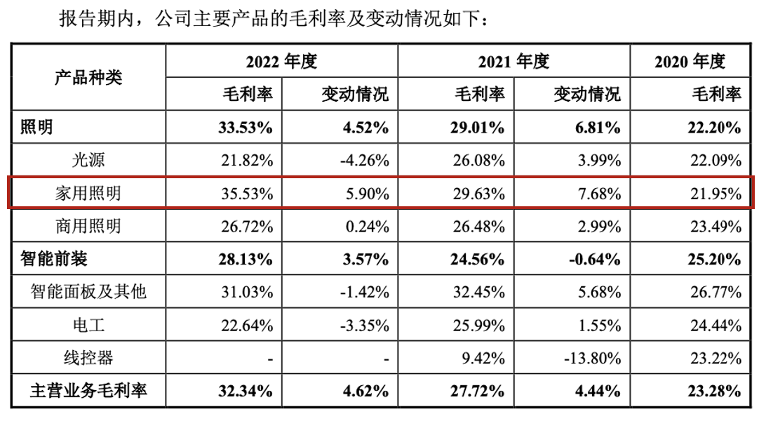 而浴霸加线上直销模式也直接带动了家用照明产品的毛利率的大幅提高,报告期内分别为21.95%、29.63%及35.53%,而家用照明产品收入占比的提升进一步带动了美智光电的主营业务毛利率的上涨。
