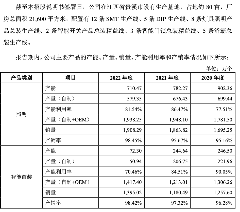 招股书显示,报告期内,美智光电照明及智能前装产品的产能分别为1148.86万个、1026.91万个、782.77万个,整体呈现下滑趋势。然而,公司实则以OEM模式为主,真正投入量产的规模远低于OEM模式。