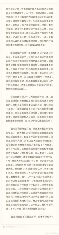 紧接着,微博上名为“先锋杯团支部”的网友发出一篇名为《直击百花奖黑幕》(目前已删除)的长文章,称自己是本届百花奖投票的101位大众评审中的一个,详细讲述了他参与投票的过程,“在颁奖典礼的上午,大家分组讨论,我只想说最后得奖的男配女配是我们首轮就淘汰不做考虑的,也几乎是所有评委达成的共识,……但领导反复强调奖项均摊,暗示我们谁来给谁,……最可笑的是晚会开始,没几个人投李易峰,屏幕上却大比分获得男配角,投女配的时候我看到周围人很多投了4号姚晨,还有1号王智,……结果大屏幕上王智只有3票,而大部分人投的姚晨,只有区区10几票!……到后面奖项,有人小声提议不要按投票器,看看结果,我们几乎一整排没人点投票器,大屏幕上依旧是总数101,请问这票是哪来的,这奖跟我大众评审到底有什么关系?”