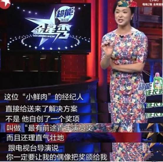 节目中,她没有指名道姓地讽刺道:某个刚演了某部偶像剧火起来的小鲜肉更逗。主办方本来打算给他颁“最佳新人奖的”,结果经纪人回绝了,说想拿影帝。小鲜肉自己也是追星族,后来知道自己的偶像也出席颁奖礼,就回来闹了,给自己自创了一个奖项。