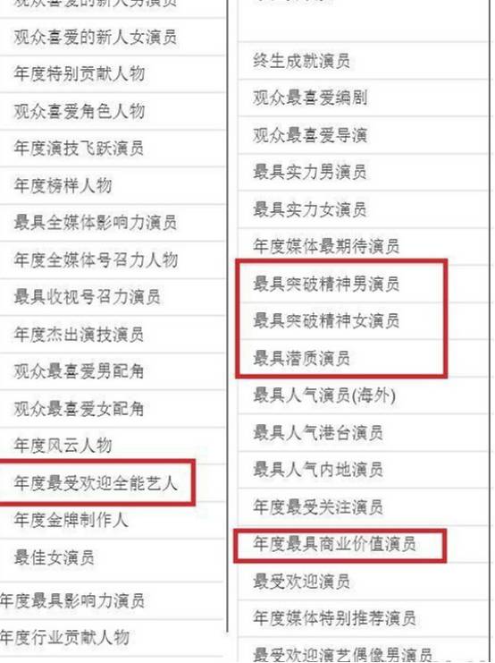 博弈往往会导致两种结果,一种是主办方坚持原则,按照评选标准只把奖项颁给获奖人。入围明星知道拿奖无望,就会拒绝陪跑出席。于是颁奖现场局面就会变得极为尴尬,不仅舞台上星光稀落,获奖名单也显然毫无悬念。另一种结果是,主办方为了获取明星的加盟,在奖项上作出让步和牺牲,使得严肃的评奖变成“排排坐分果果”、人人有奖皆大欢喜的“平衡”。毕竟每一个当红明星背后都是庞大的粉丝团队、潜在的收视群体和往后的合作关系。在这种利益关系的驱使下,很多主办方不得不费尽心思创造各种奖项名称,尽量让每个人都有奖可拿。