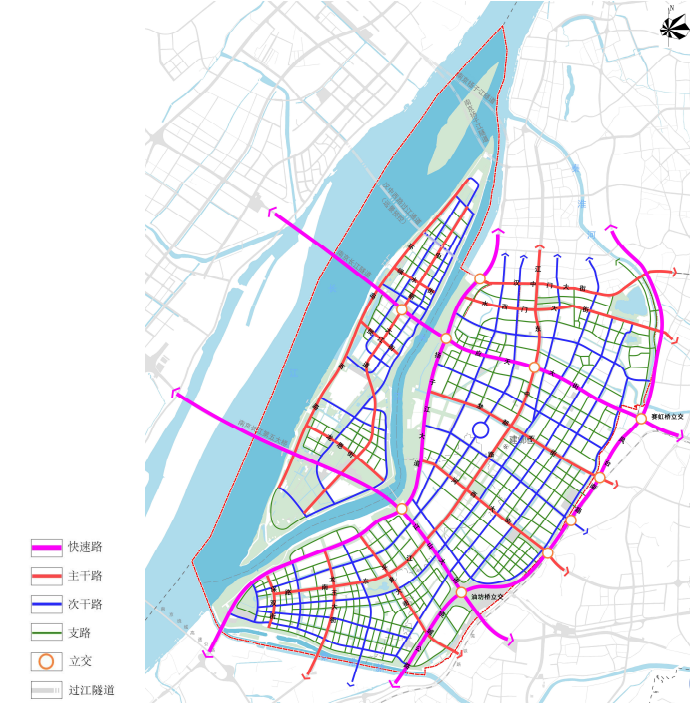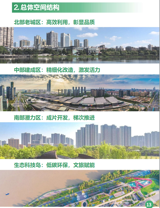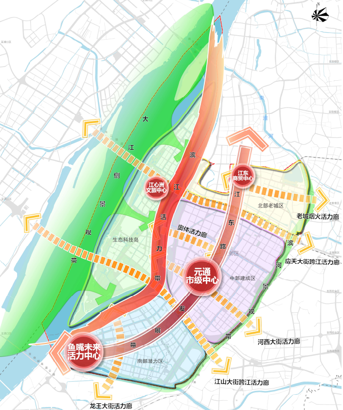 四带:滨江活力带、江东路发展带、大江侧景观带、滨河景观带;